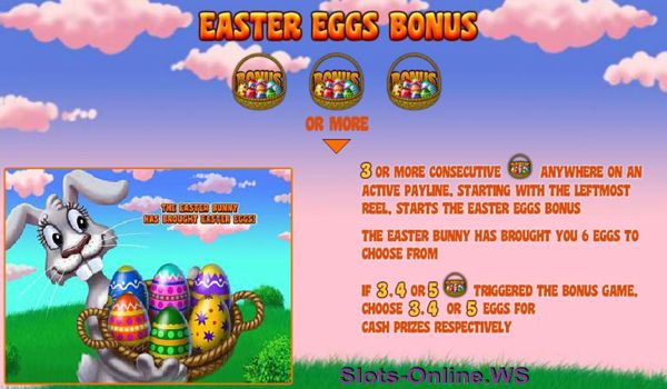 Easter Egg Bonus You have the chance to meet the Easter Bunny himself in the cute Easter Eggs bonus round. Depending on how many Easter baskets you have received, you're allowed to pick 3, 4 or 5 colourful eggs. Each egg will reveal a nice cash prize. This is an easy way to increase your online casino balance as every single Easter Egg has a coin prize attached to it.