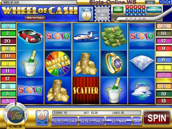 Wheel Of Cash is a 5 reel, 20 payline and 200 coin online slot machine game with Wild & 2 Scatter symbols, bonus feature and free spins with increasing multipliers. This Money-themed game is one of the first and very popular Rival's video slots with brightly coloured graphics, animated characters, a Wheel of Fortune style bonus game and a lotto side-game called Sloto.