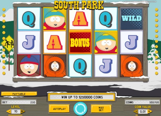 South Park is a 5-reel, 25-payline video slot machine featuring Wild substitutes, Sticky Wilds, 4 Bonus Games and 3 mini features. The game is played with 25 bet lines fixed, 1 to 10 coins per each line and different coin values from just 1c.